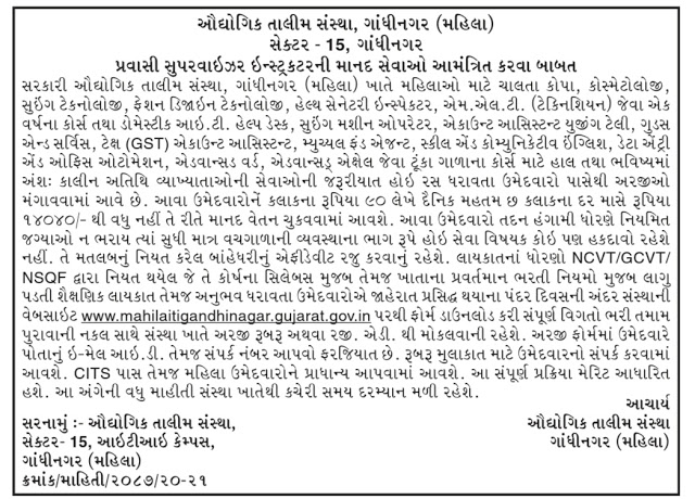 Join Now ITI Gandhinagar Pravasi Supervisor Instructor Posts Recruitment 2021 - The ITI Gandhinagar has released an employment notification inviting candidates to apply for the positions of below mentioned Pravasi Supervisor Instructor Posts.This is a great chance for interested candidates who are looking for ITI Gandhinagar Jobs 2021. Before applying for the post, candidates should ensure that he/ she fulfills the eligibility criteria and other conditions mentioned in this advertisement. The last day for registration is March 24. Candidates are advised to carefully read the full advertisement for details of educational qualification and other eligibility criteria before submission of application.more detailed information regarding educational qualification,age limit,selection procedure,how to apply ,last date for ITI Gandhinagar Supervisor Instructor Posts Vacancy 2021 are mentioned below.