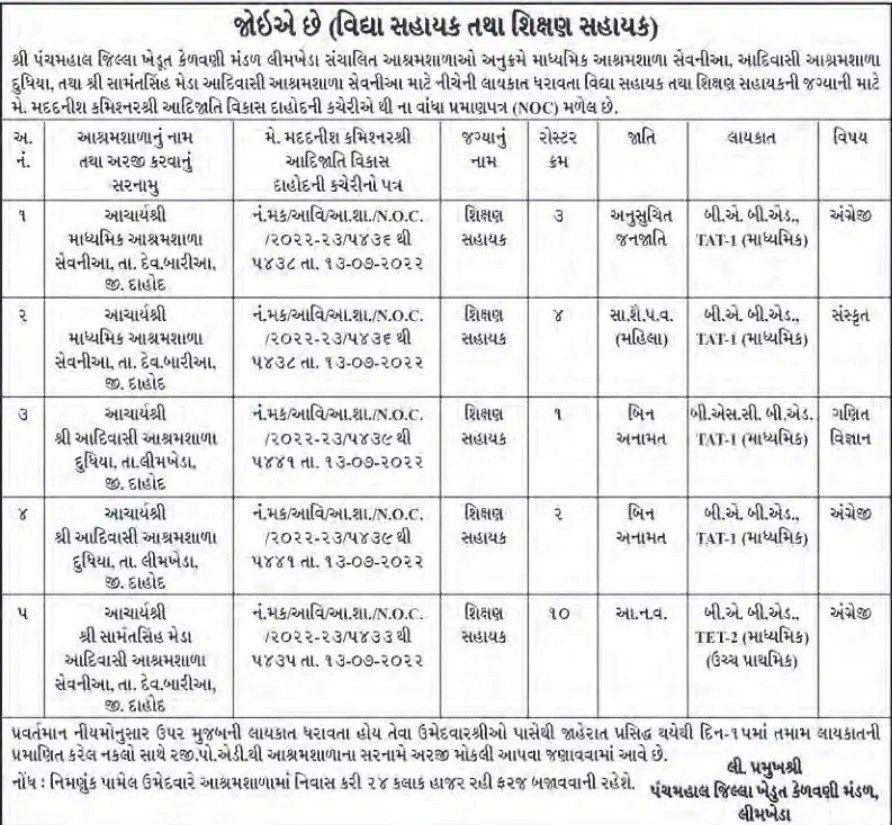 Join Now Shree Panchmahal Jilla Khedut Kelvani Mandal Limkheda Ashram Shala Shikshan Sahayak Recruitment 2022